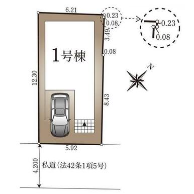| 用途地域 | 1種低層 | 接道状況 | 南東4.2m 私道 接面5.9m 位置指定あり |